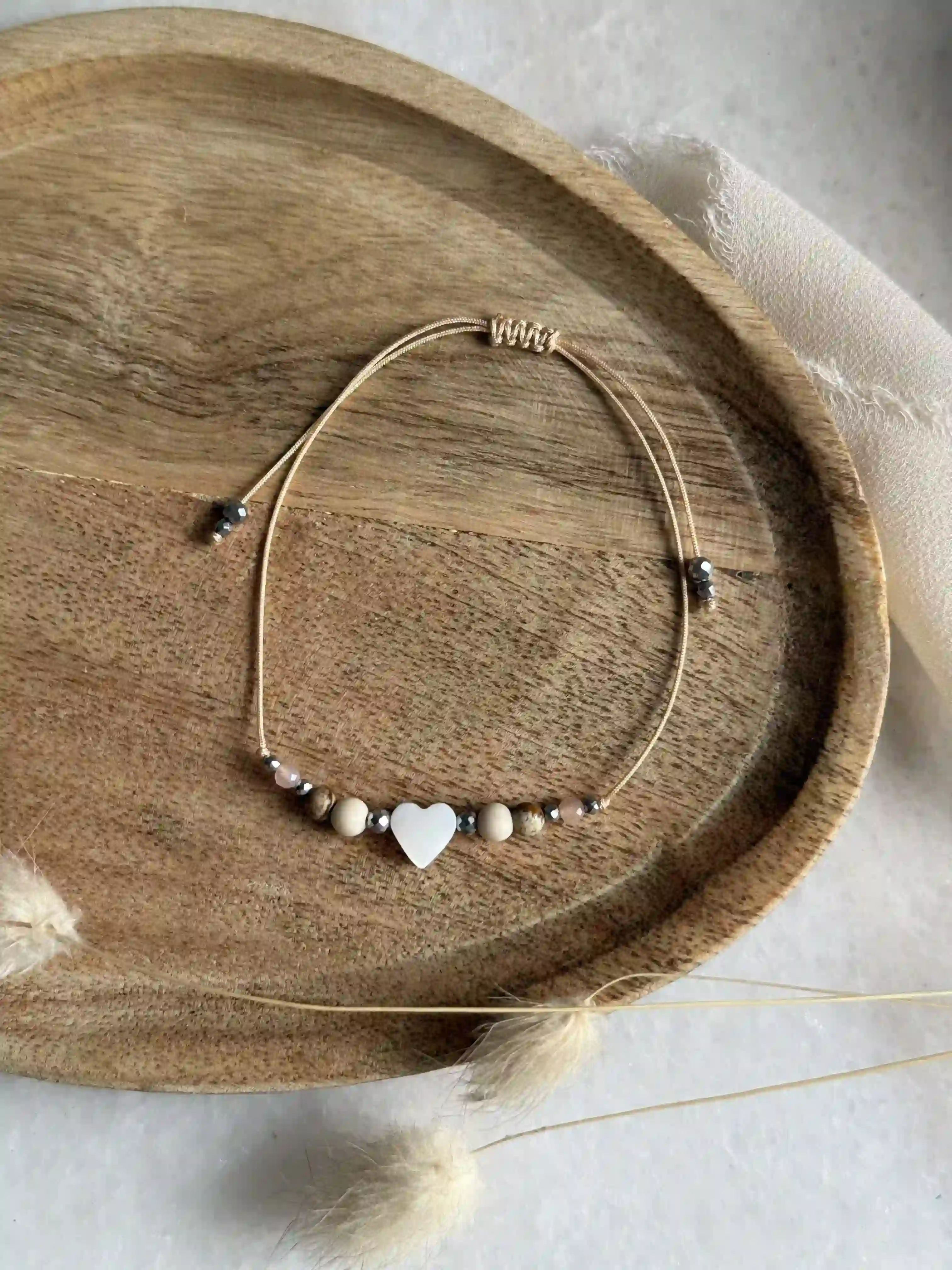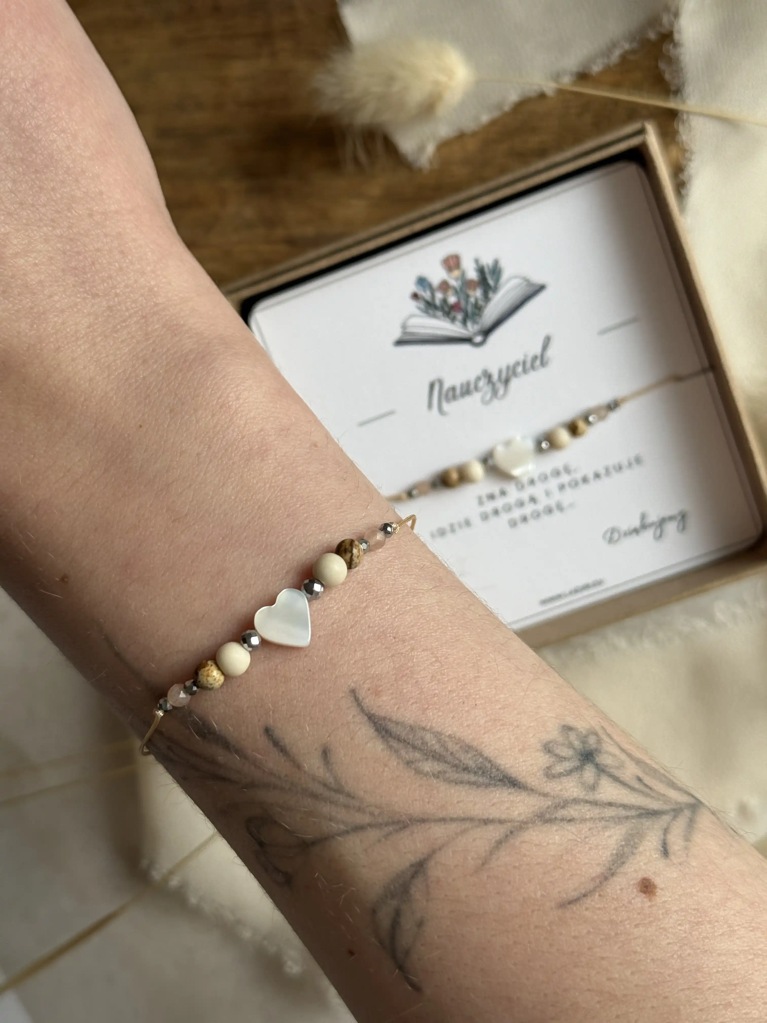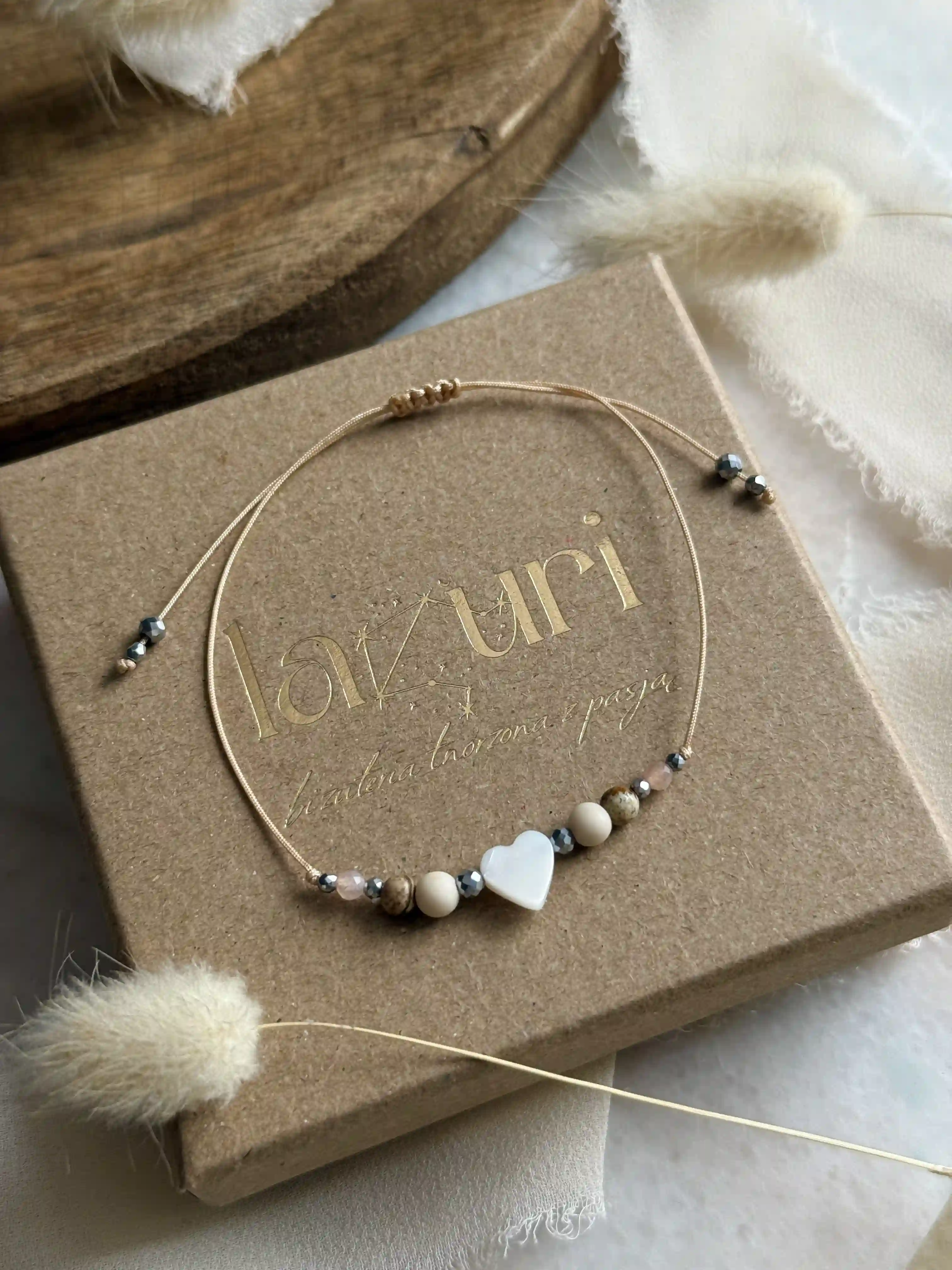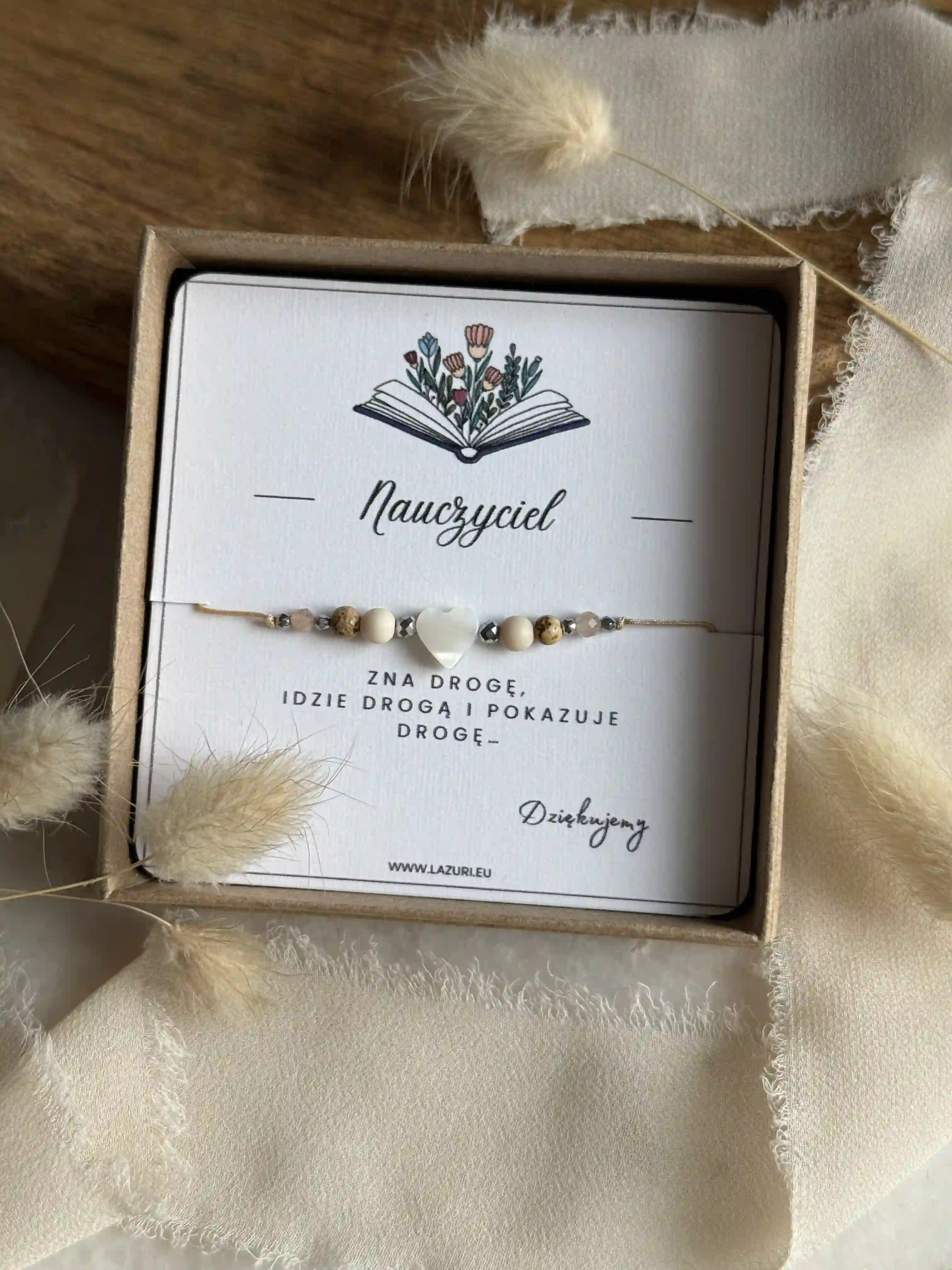 Bransoletka MENTORA w wersji beżowej to harmonijne połączenie barw ziemi i ciepłego blasku słońca. Wykonana na beżowym sznurku, łączy kojący kamień rzeczny, pełen optymizmu kamień słoneczny oraz malowniczy jaspis krajobrazowy. Centralnym punktem jest lśniące serce z masy perłowej, otoczone akcentami srebrnego hematytu. To biżuteria pełna spokoju, idealna jako podziękowanie dla nauczycielki, wychowawcy czy mentora. Zapakowana w pudełko z jedną z dwóch dedykacji do wyboru.