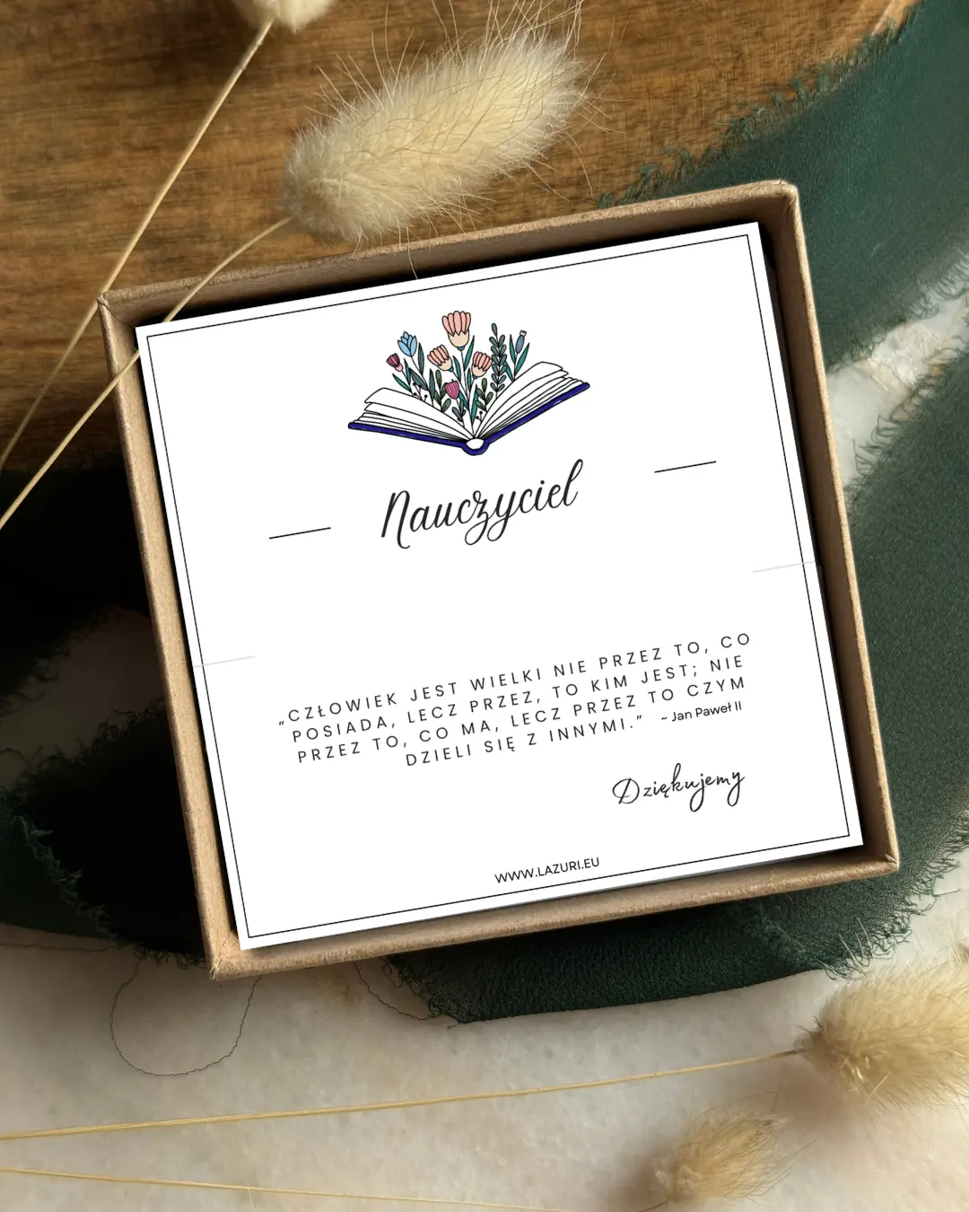 Gotowe opakowanie: Bransoletka spoczywa na eleganckiej karcie wewnątrz ekologicznego pudełka jubilerskiego, dzięki czemu otrzymujesz prezent gotowy do wręczenia.