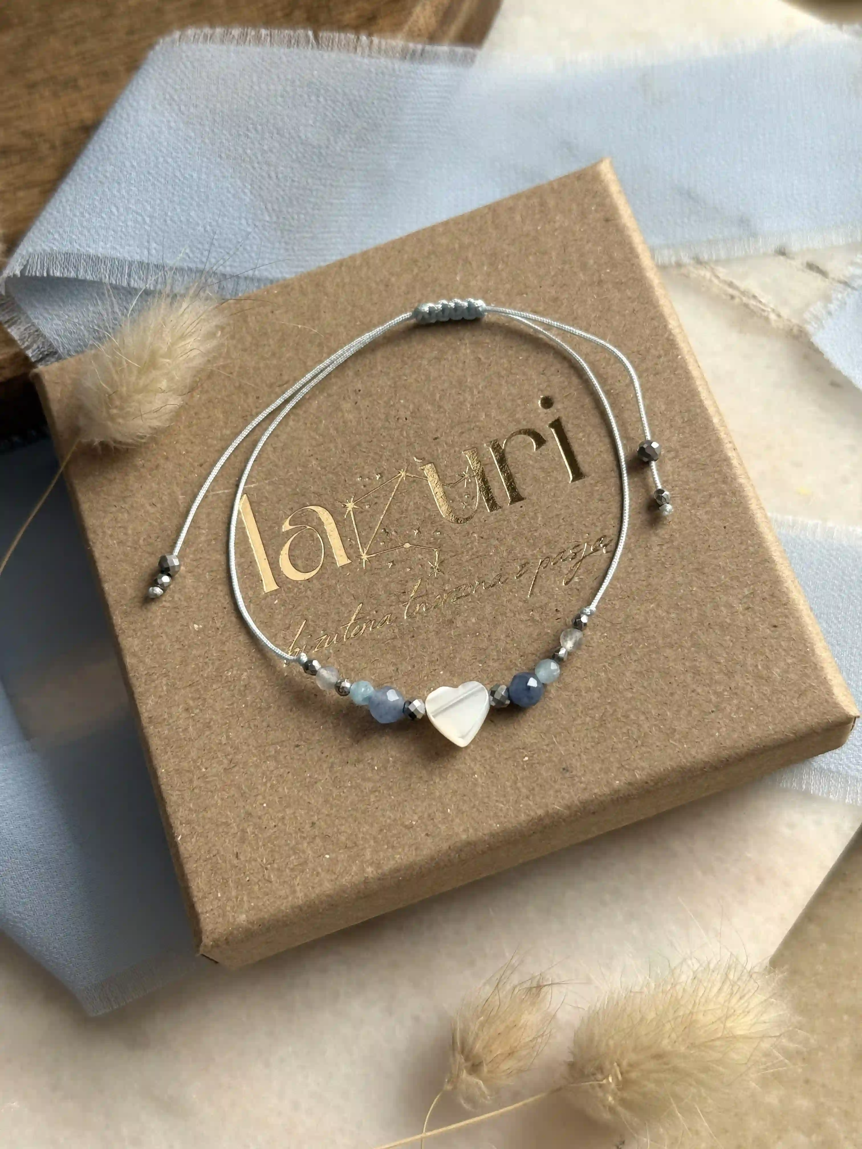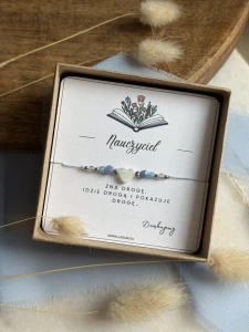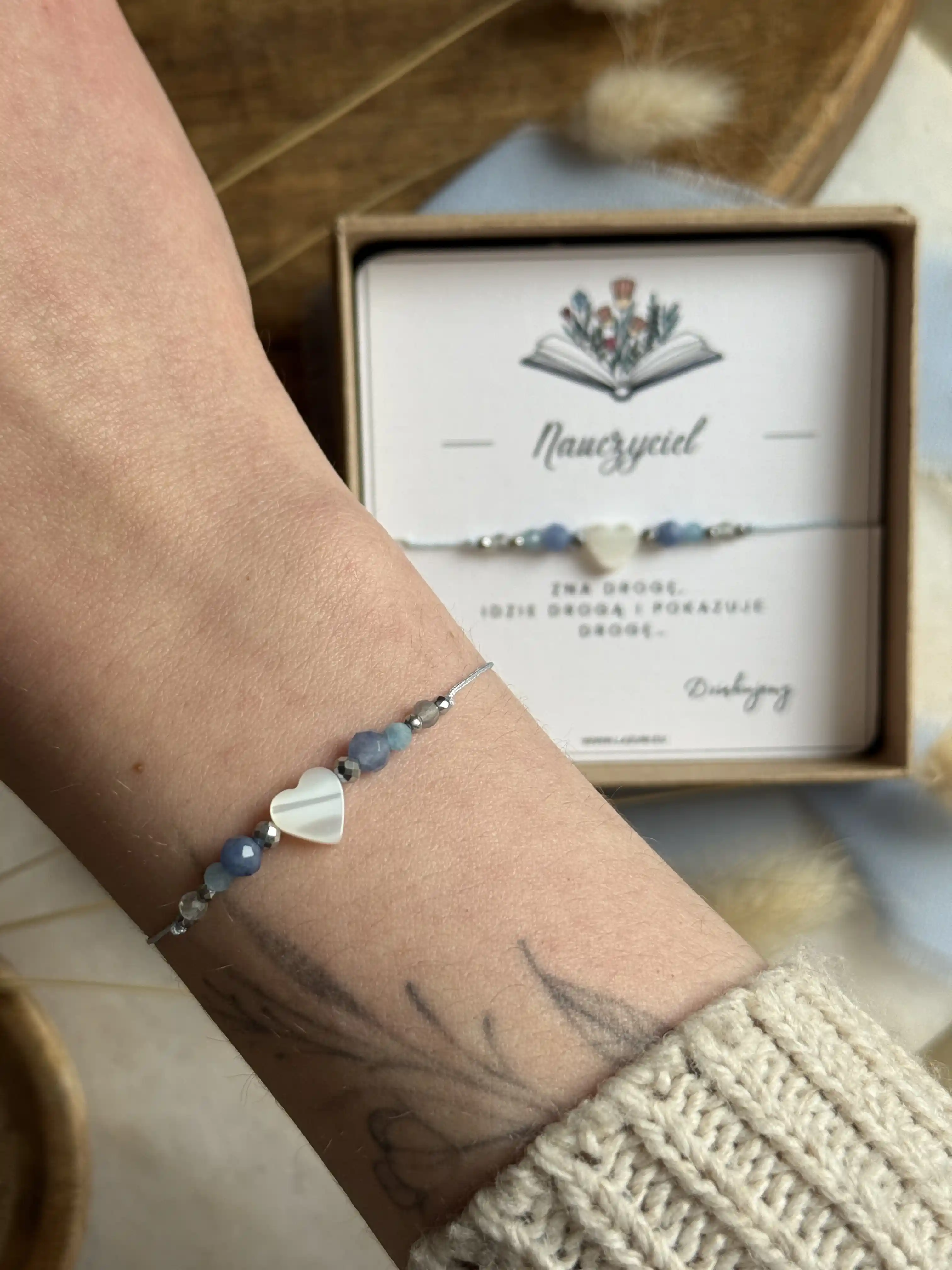 Bransoletka MENTORA w odcieniu błękitu to biżuteria o kojącej energii, idealna dla osób pełniących rolę przewodników i mentorów. Wykonana na błękitnym sznurku, łączy w sobie szlachetny akwamaryn, mistyczny kyanitoraz pełen blasku labradoryt. Centralnym elementem jest serce z białej masy perłowej, dopełnione akcentami srebrnego hematytu. Bransoletka zapakowana jest w eleganckie pudełko z jedną z dwóch dedykacji do wyboru, stanowiąc wzruszający prezent dla nauczycielki lub przedszkolanki.