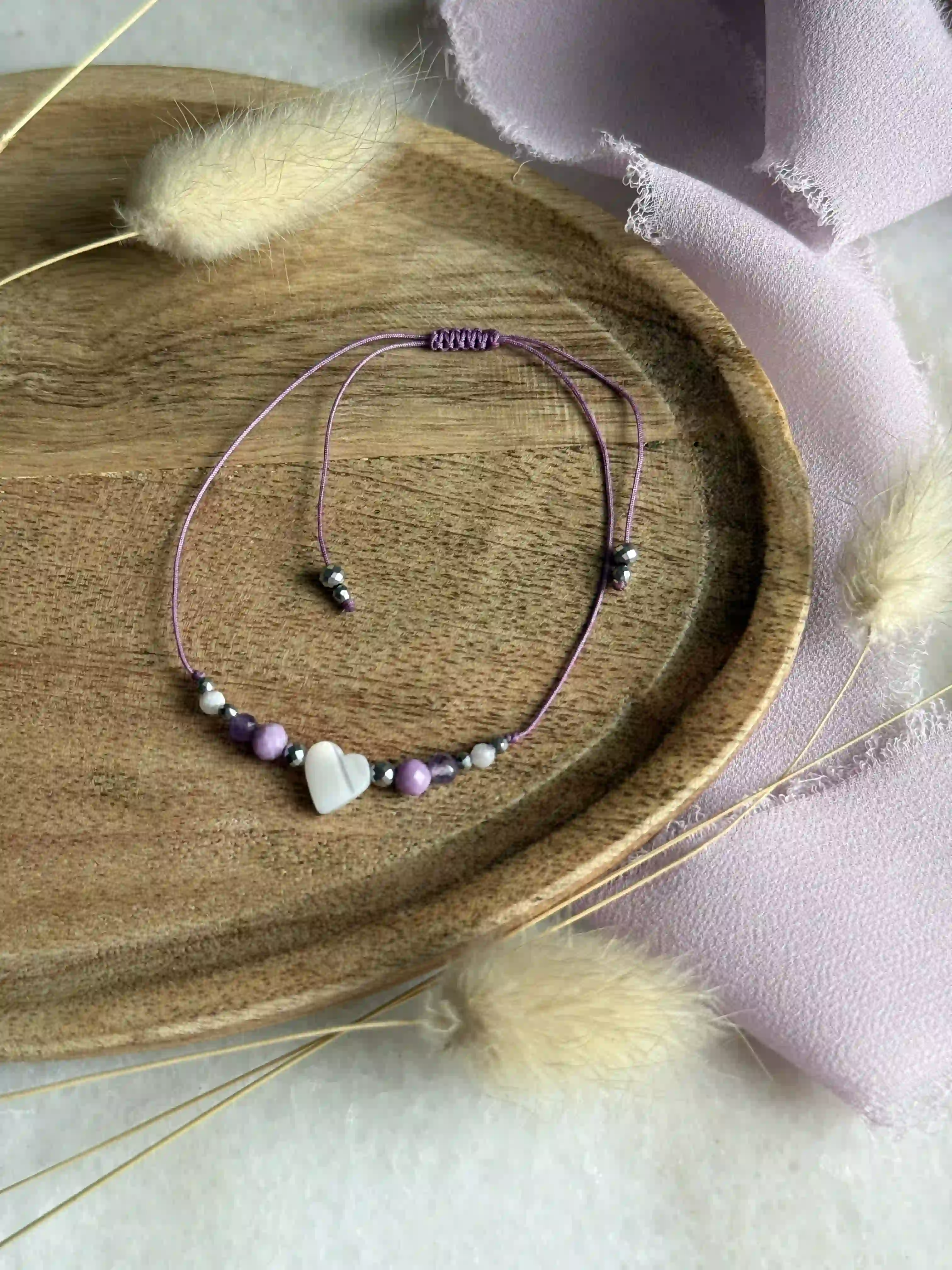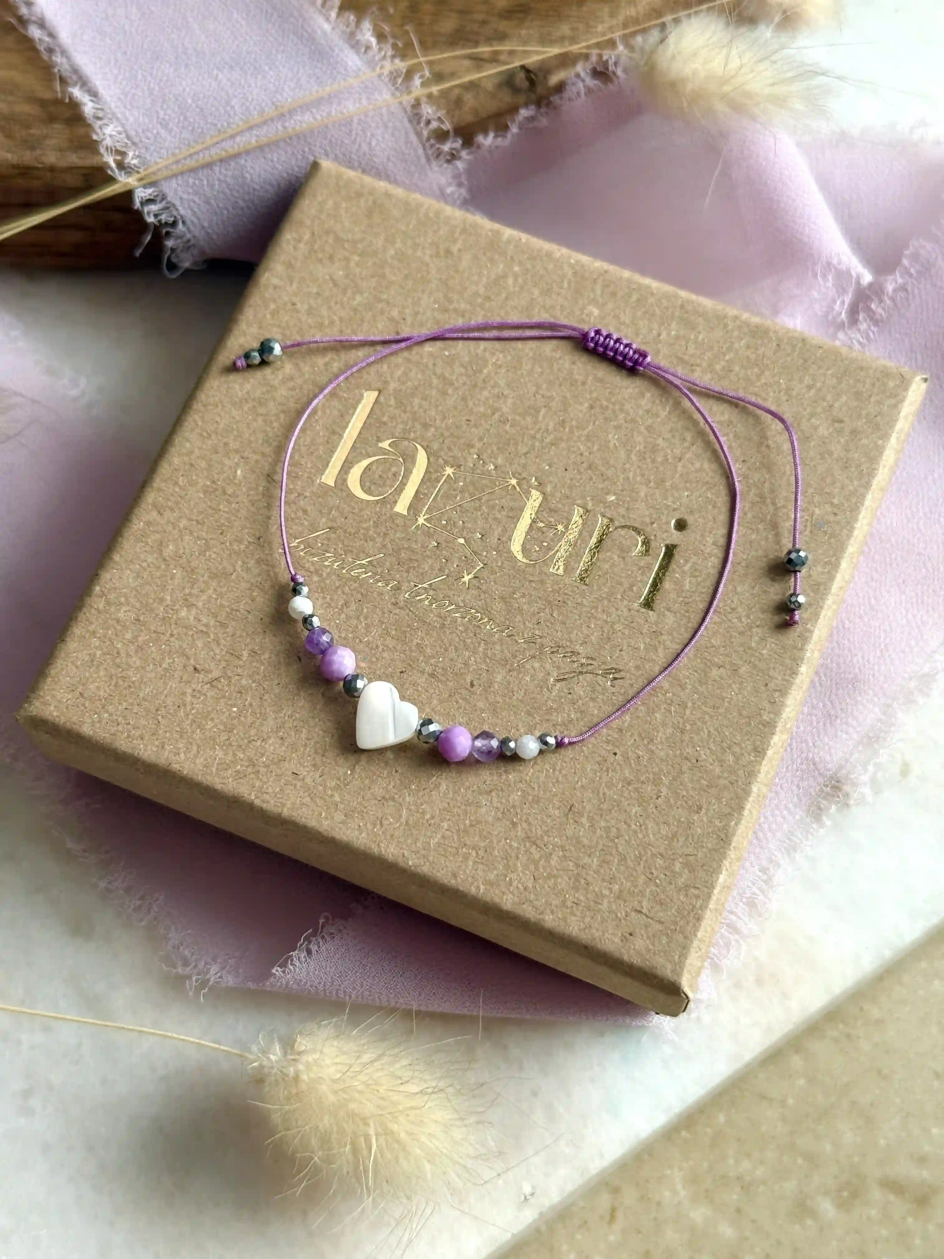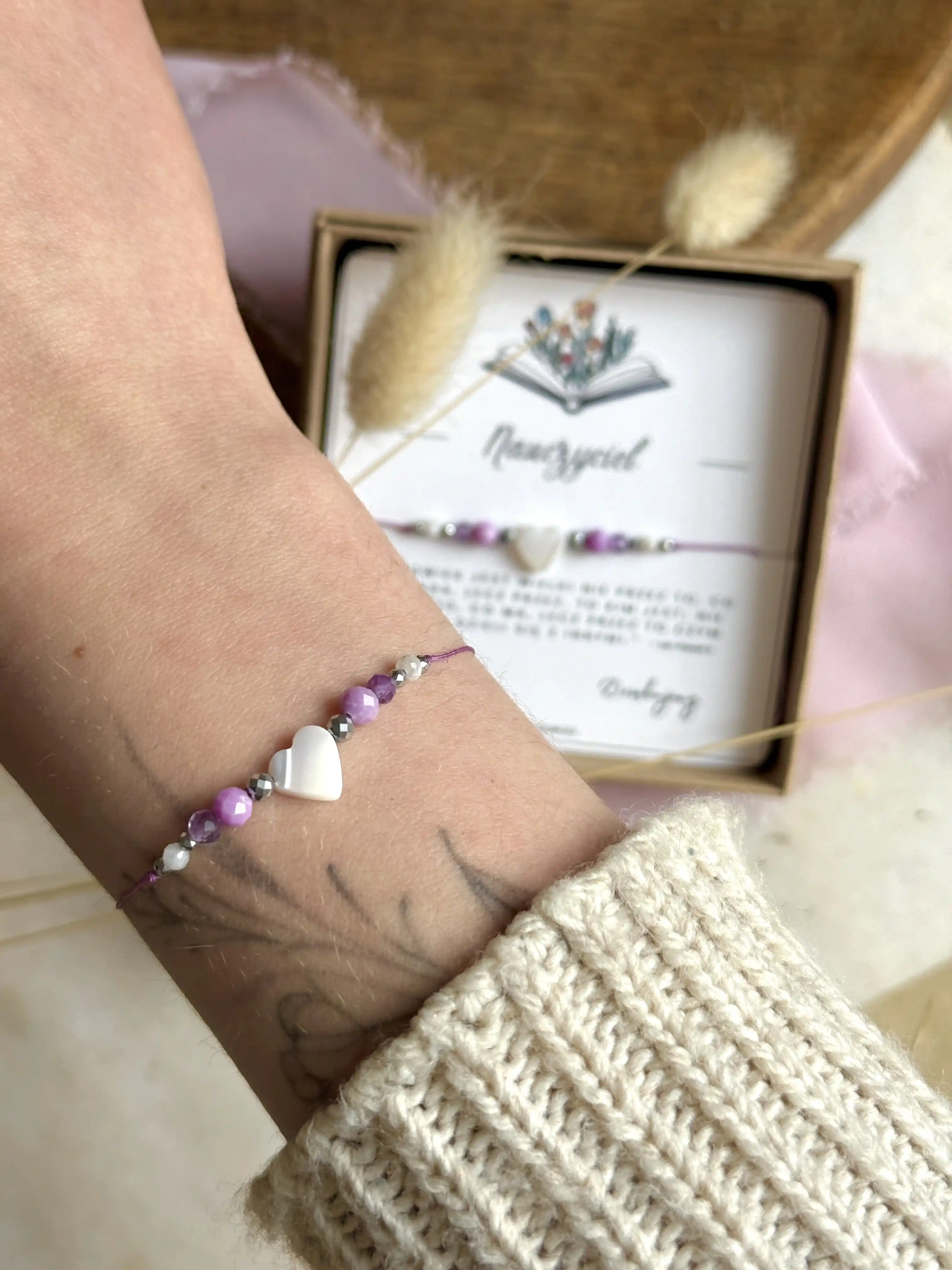 Bransoletka MENTORA to subtelna i pełna klasy biżuteria stworzona z myślą o wyjątkowych kobietach – nauczycielkach, przedszkolankach i mentorkach. Wykonana na bazie delikatnego fioletowego sznurka, łączy w sobie harmonijną energię ametystu, kamienia księżycowego oraz rzadkiego fosfosyderytu. Centralnym punktem jest lśniące serce z białej masy perłowej, symbolizujące czystość intencji i wdzięczność. Całość dopełnia srebrny hematyt oraz eleganckie pudełko z możliwością wyboru jednej z dwóch wzruszających dedykacji.