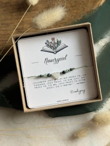 Prezent gotowy do wręczenia: Każda bransoletka trafia do Ciebie w ekologicznym pudełku z motywem książki i kwiatów – gotowe podziękowanie na zakończenie roku szkolnego lub Dzień Nauczyciela.