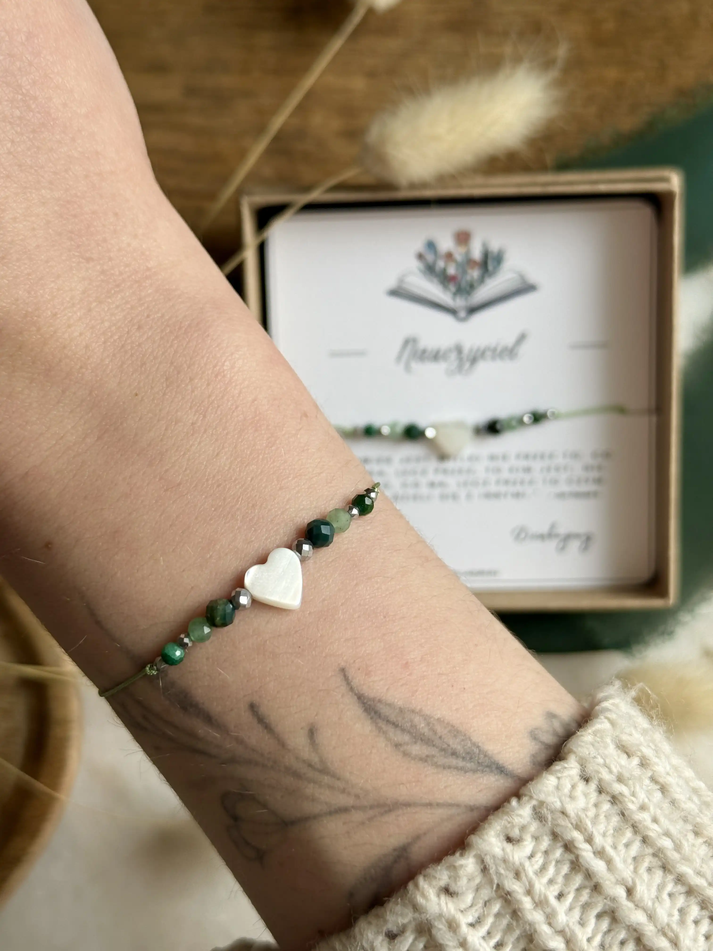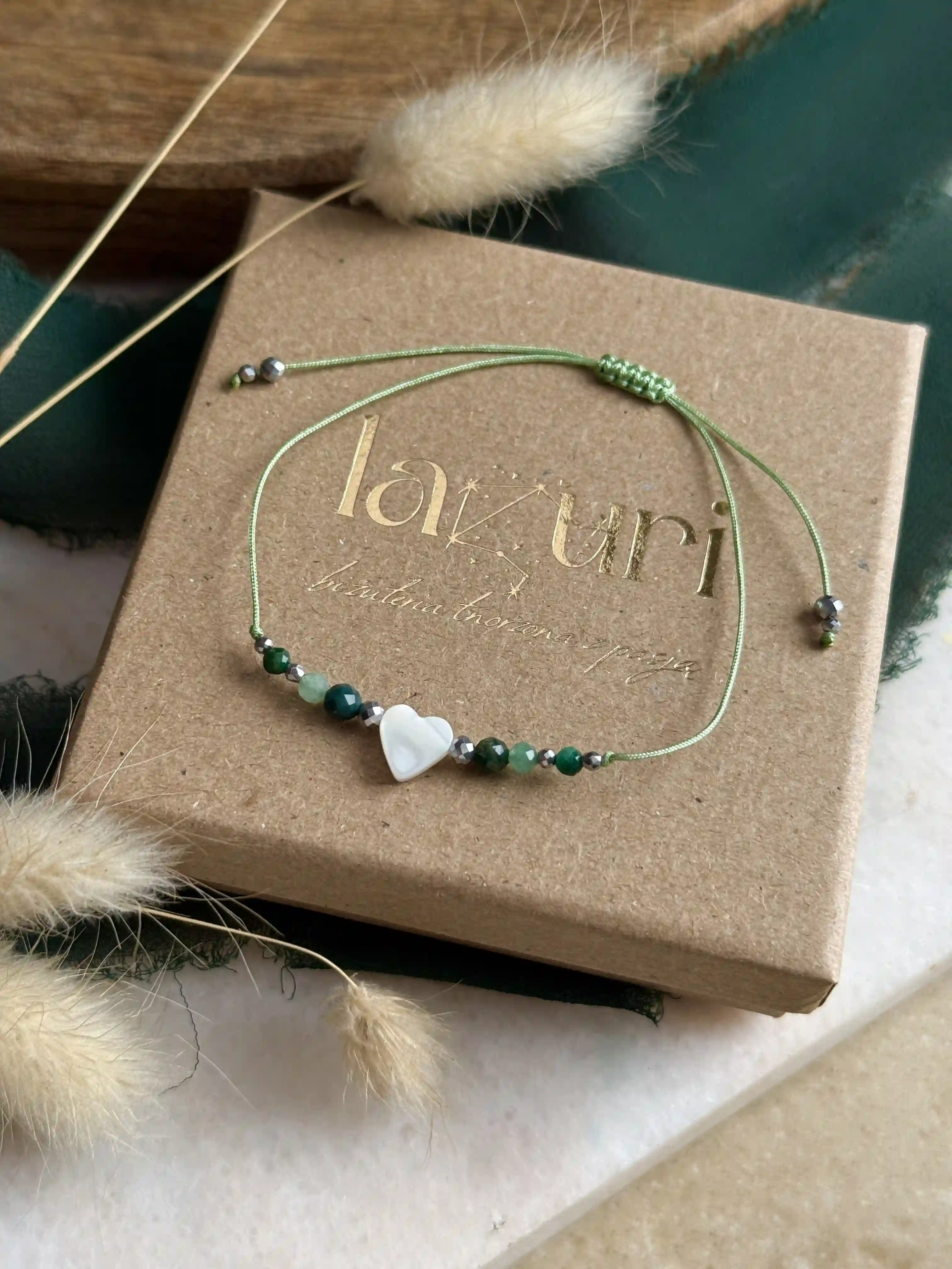 Bransoletka MENTORA w wersji zielonej to biżuteria, która czerpie z kojącej mocy natury. Wykonana na zielonym sznurku, łączy w sobie kamienie o pięknych, leśnych barwach: awenturyn zielony, agat mszysty oraz jadeit. Centralnym punktem jest lśniące serce z białej masy perłowej, dopełnione akcentami srebrnego hematytu. To pełen elegancji talizman, zapakowany w pudełko z jedną z dwóch wzruszających dedykacji do wyboru.
