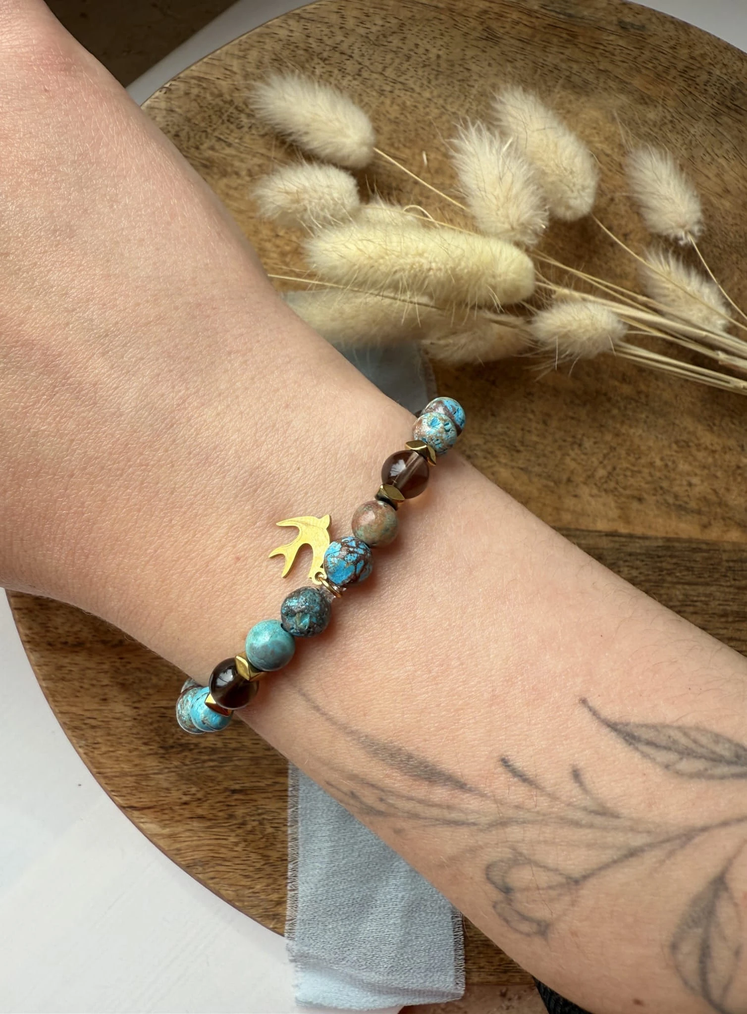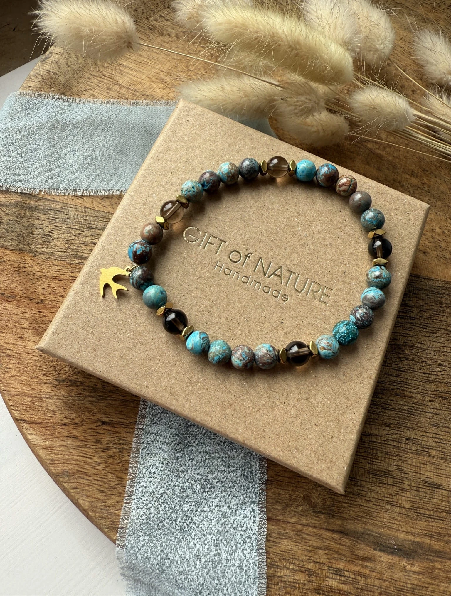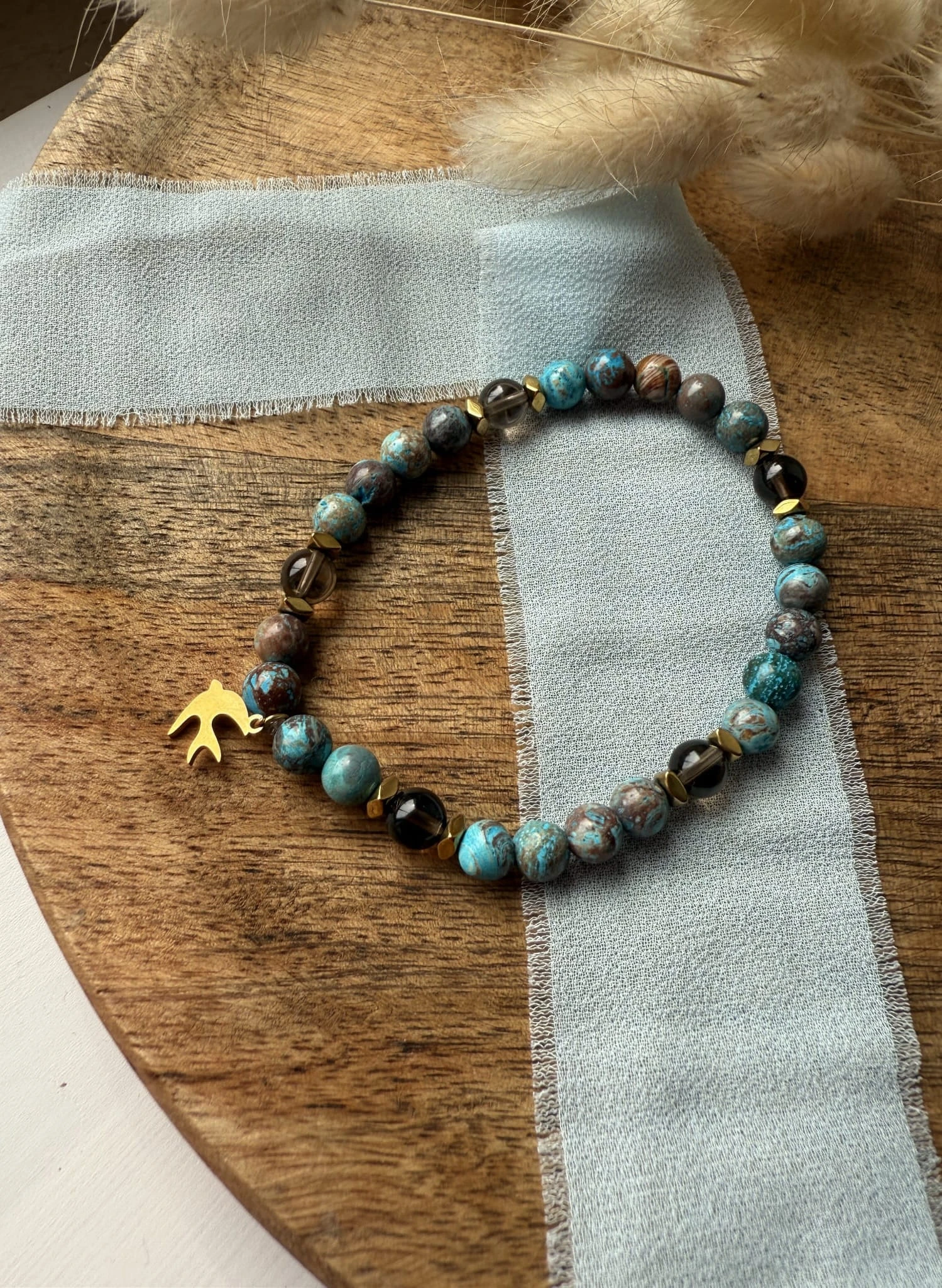 TRAGAR to projekt dedykowany kobietom, które kochają naturę i wierzą w moc symboli. W Lazuri połączyliśmy surowość ziemistych kamieni z delikatnością motywu jaskółki, tworząc biżuterię, która opowiada historię o powrotach do siebie i odwadze w sięganiu po marzenia. Turkusowe tony jaspisu przeplatane dymnym brązem kwarcu sprawiają, że bransoletka przyciąga wzrok swoją nieoczywistą głębią i elegancją.