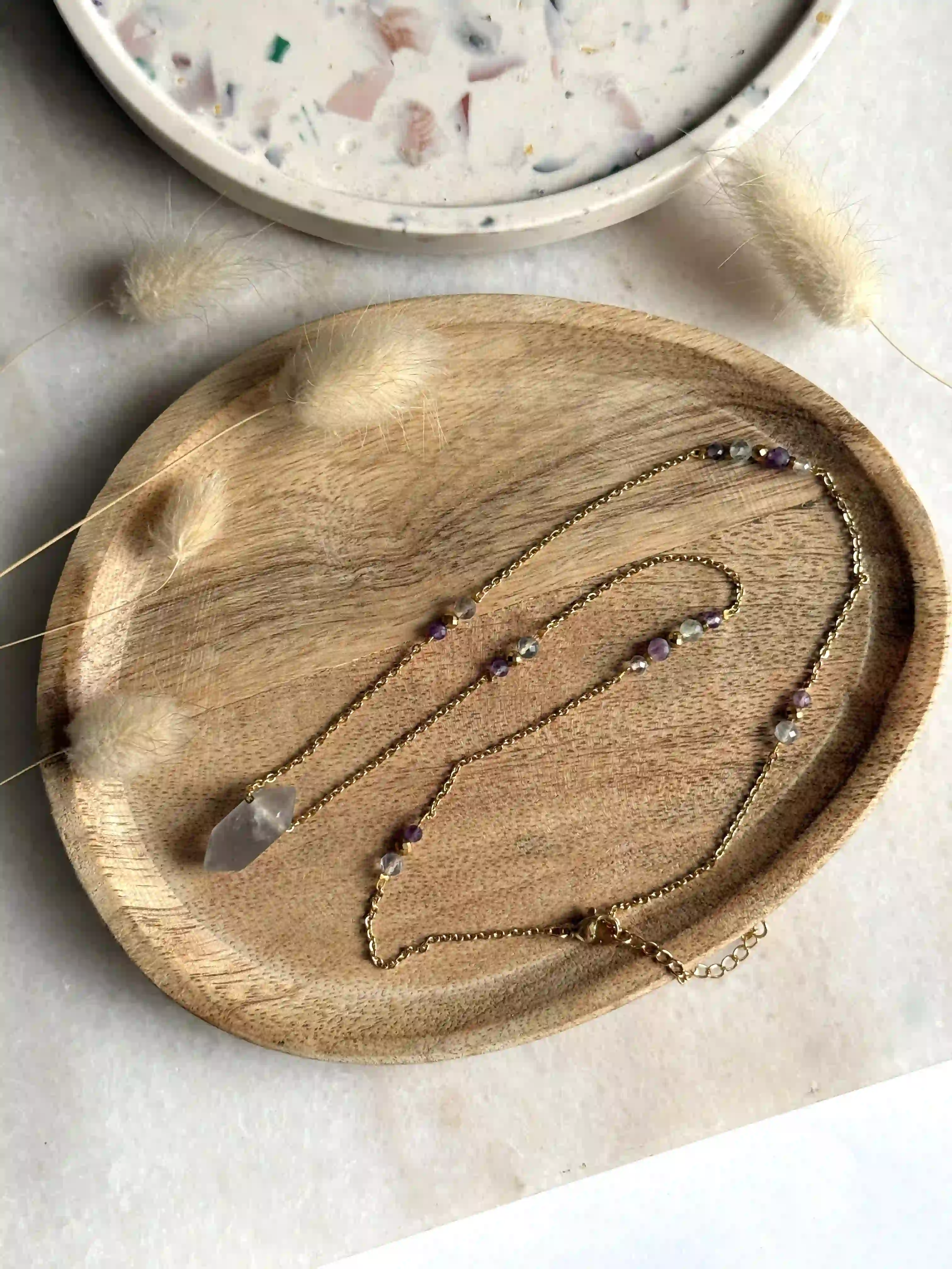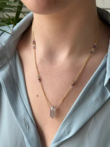 Naszyjnik KIMI w tej odsłonie to biżuteryjny talizman stworzony z myślą o uczniach i osobach uczących się. Wykonany na bazie eleganckiego łańcuszka ze stali chirurgicznej w kolorze złotym, łączy w sobie intelektualną moc fluorytu z wyciszającą energią ametystu. Centralnym punktem jest okazały, fasetowany kryształ fluorytu, który wraz z fioletowymi akcentami tworzy kompozycję sprzyjającą jasności umysłu. Naszyjnik posiada zapięcie na karabińczyk oraz 5-centymetrową przedłużkę do idealnej regulacji.
