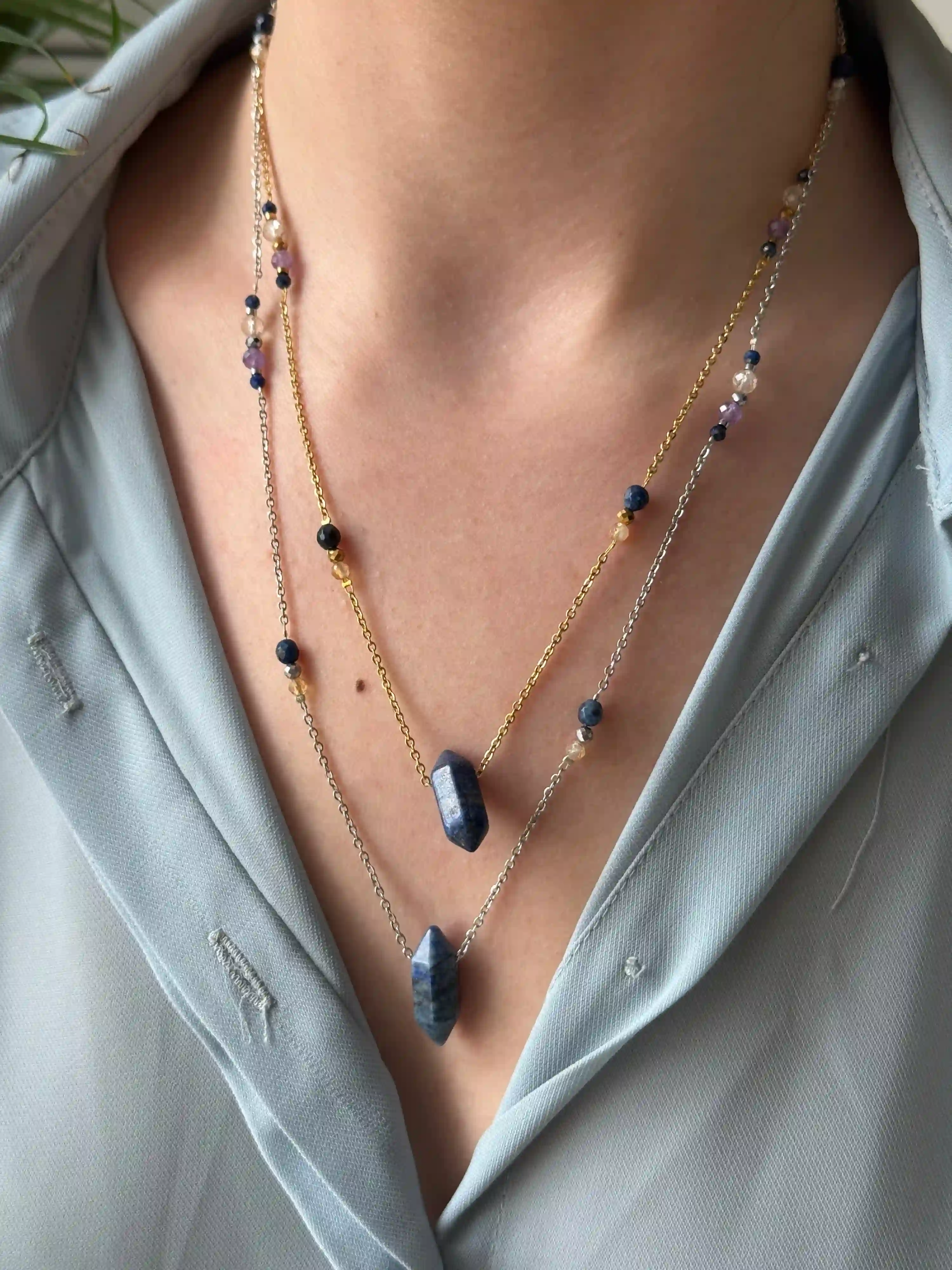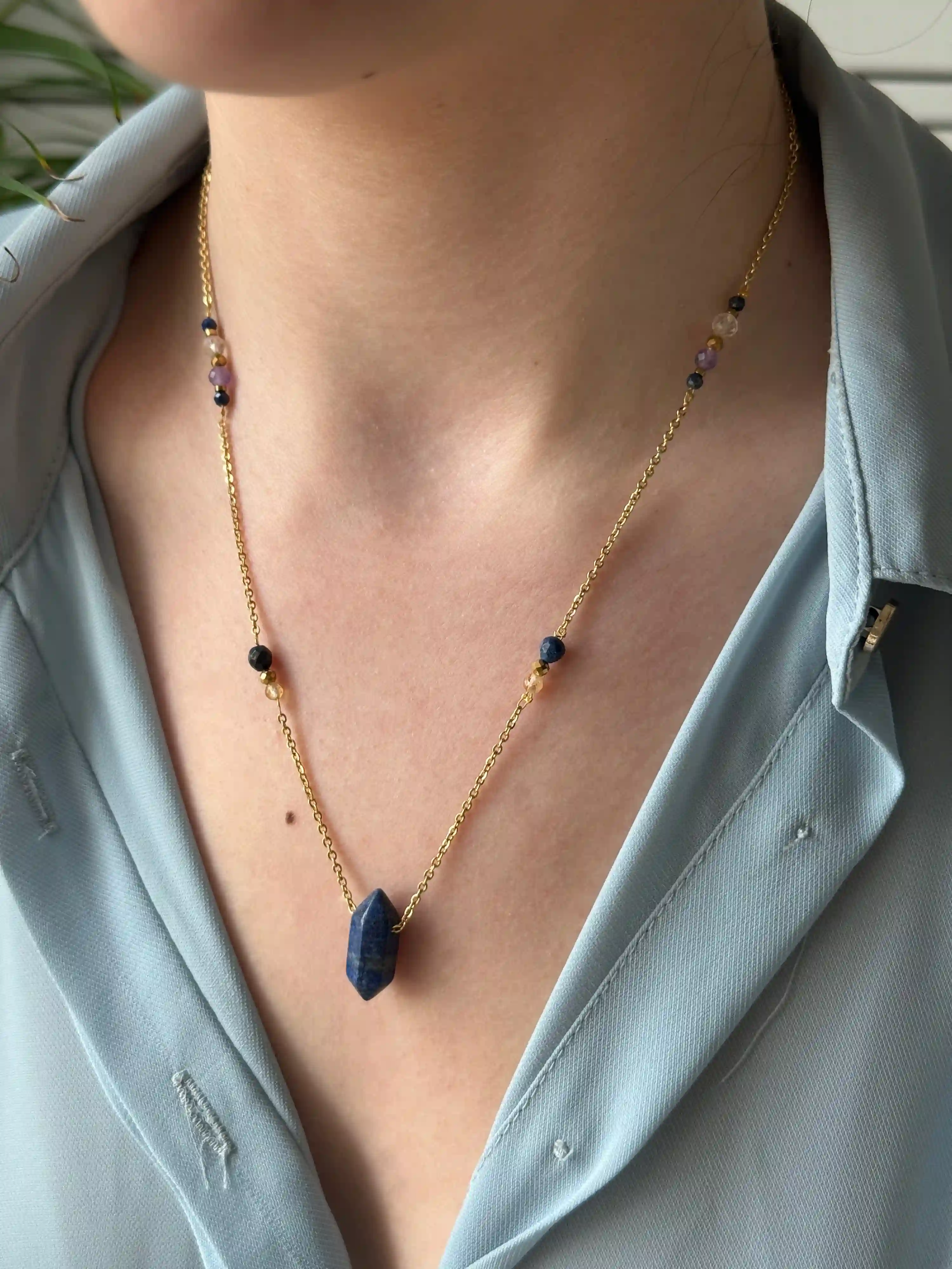 Naszyjnik KIMI w wersji z lapis lazuli to biżuteria o niezwykle głębokiej barwie i silnej symbolice. Dostępny w wersji złotej oraz srebrnej (stal chirurgiczna), łączy w sobie gwieździsty granat lapisu z radosnym blaskiem cytrynu oraz kojącym fioletem ametystu. Centralnym punktem jest okazały, fasetowany kryształ lapis lazuli, który na tle złotego lub srebrnego łańcuszka prezentuje się niezwykle szlachetnie. Naszyjnik posiada zapięcie na karabińczyk oraz 5-centymetrową przedłużkę.