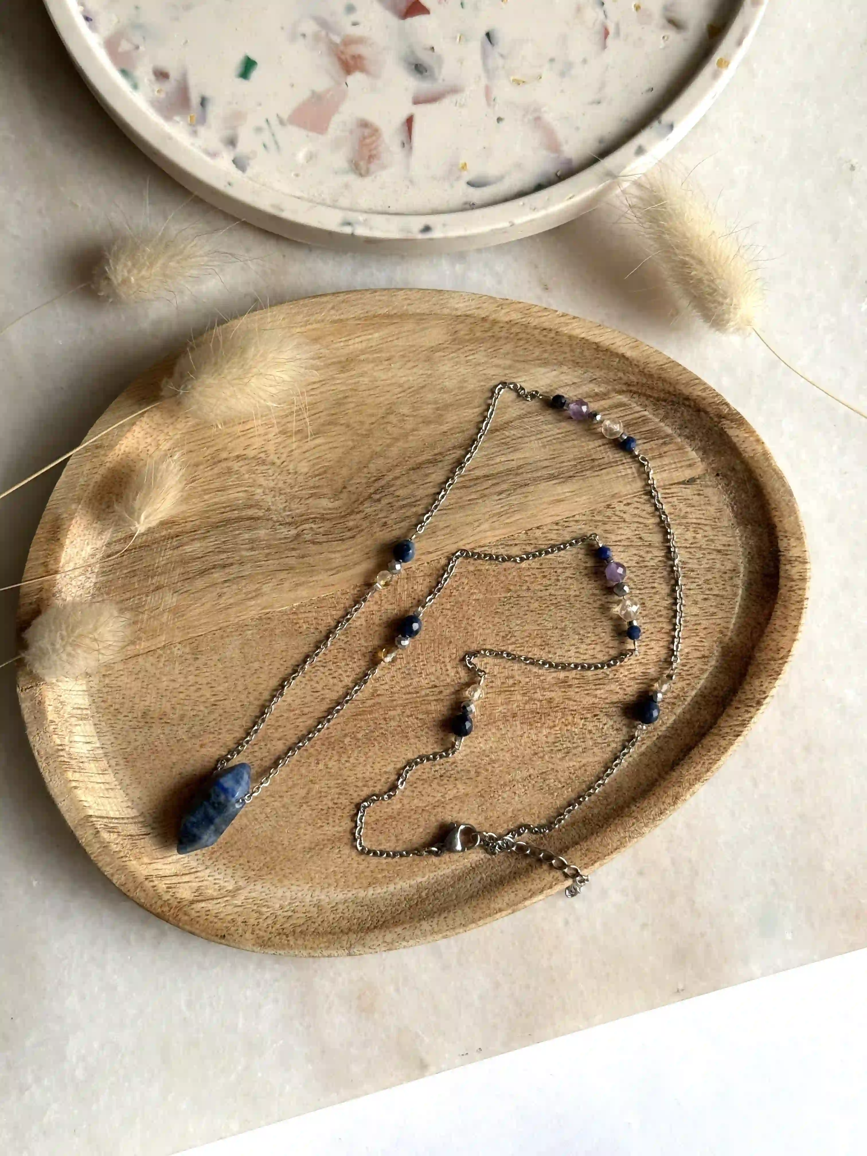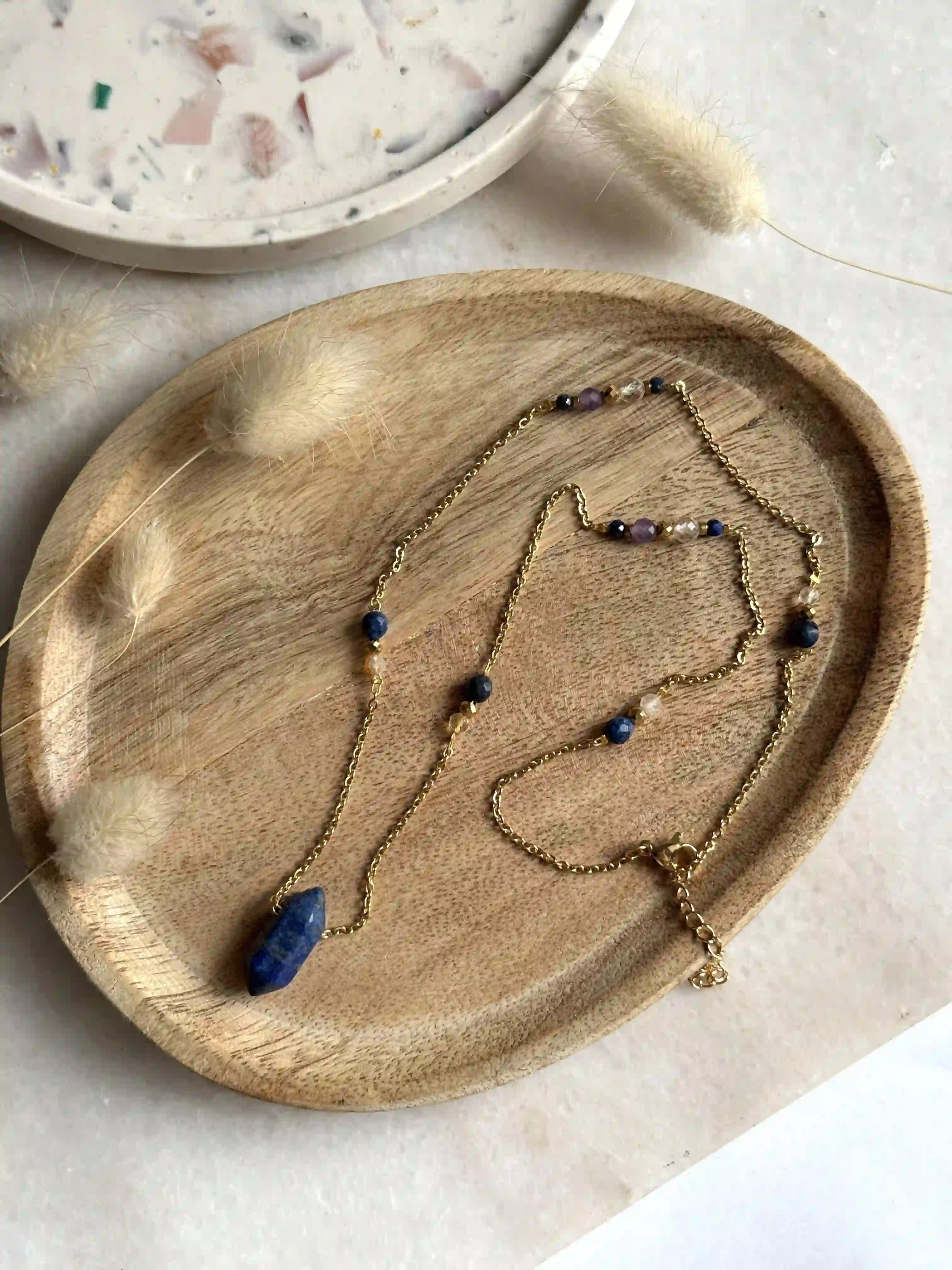 Lapis Lazuli (centralny kryształ i paciorki): Kamień mądrości, prawdy i duchowej wiedzy. Wspiera jasność umysłu, ułatwia komunikację i przynosi wewnętrzny spokój. Jego głęboki błękit od wieków utożsamiany jest z królewskim statusem.