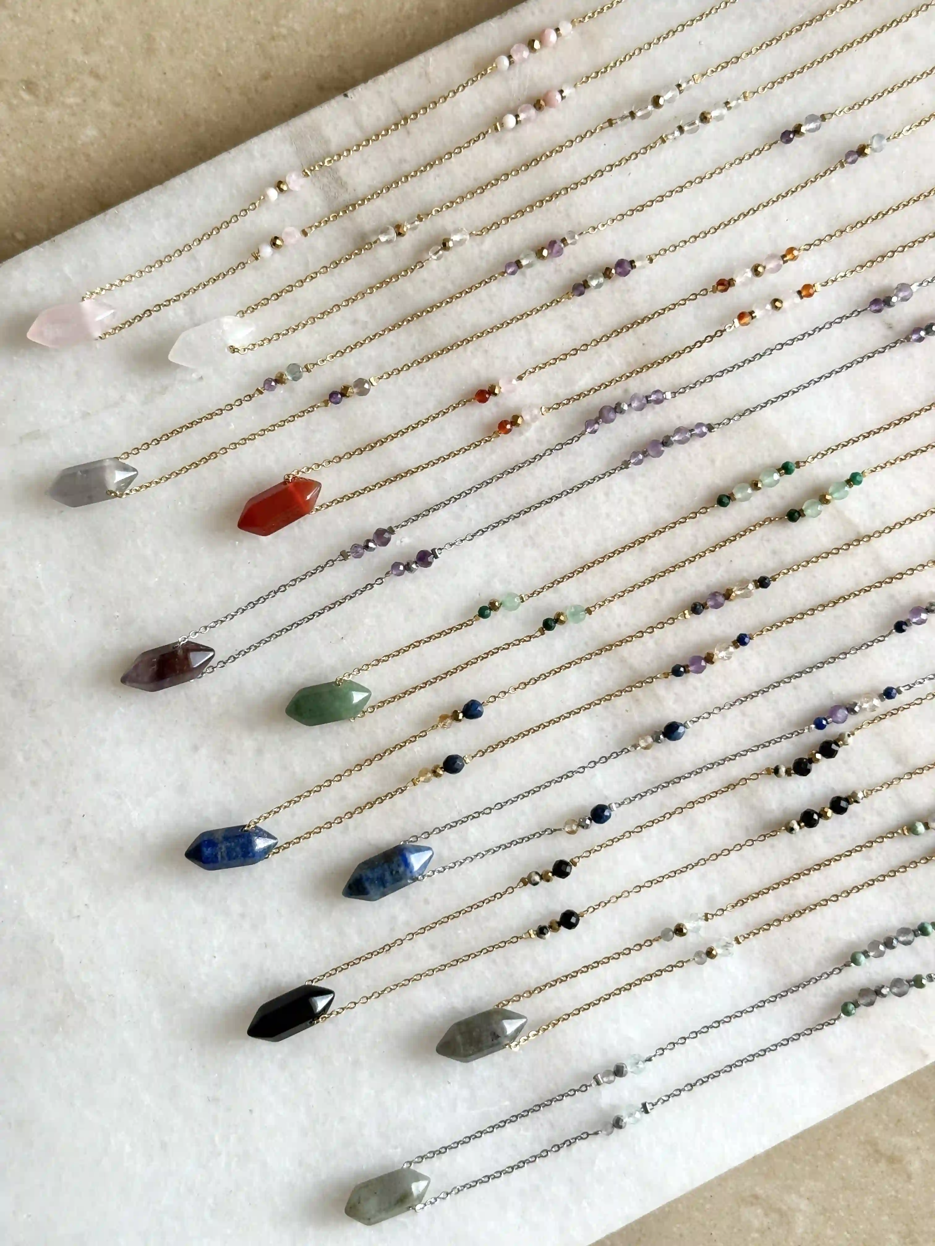 Hematyt (Złoty lub Srebrny): Drobne, lśniące przekładki podkreślają jubilerski charakter naszyjnika, symbolizując siłę i uziemienie.