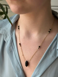 Model KIMI w wersji Black to propozycja dla kobiet ceniących biżuterię z charakterem, która niesie ze sobą poczucie bezpieczeństwa i pewności siebie. Klasyczne połączenie głębokiej czerni minerałów ze złotem łańcuszka tworzy dodatek, który jest jednocześnie nowoczesny i ponadczasowy. To idealny wybór zarówno do wieczorowych kreacji, jak i minimalistycznych, dziennych zestawów.